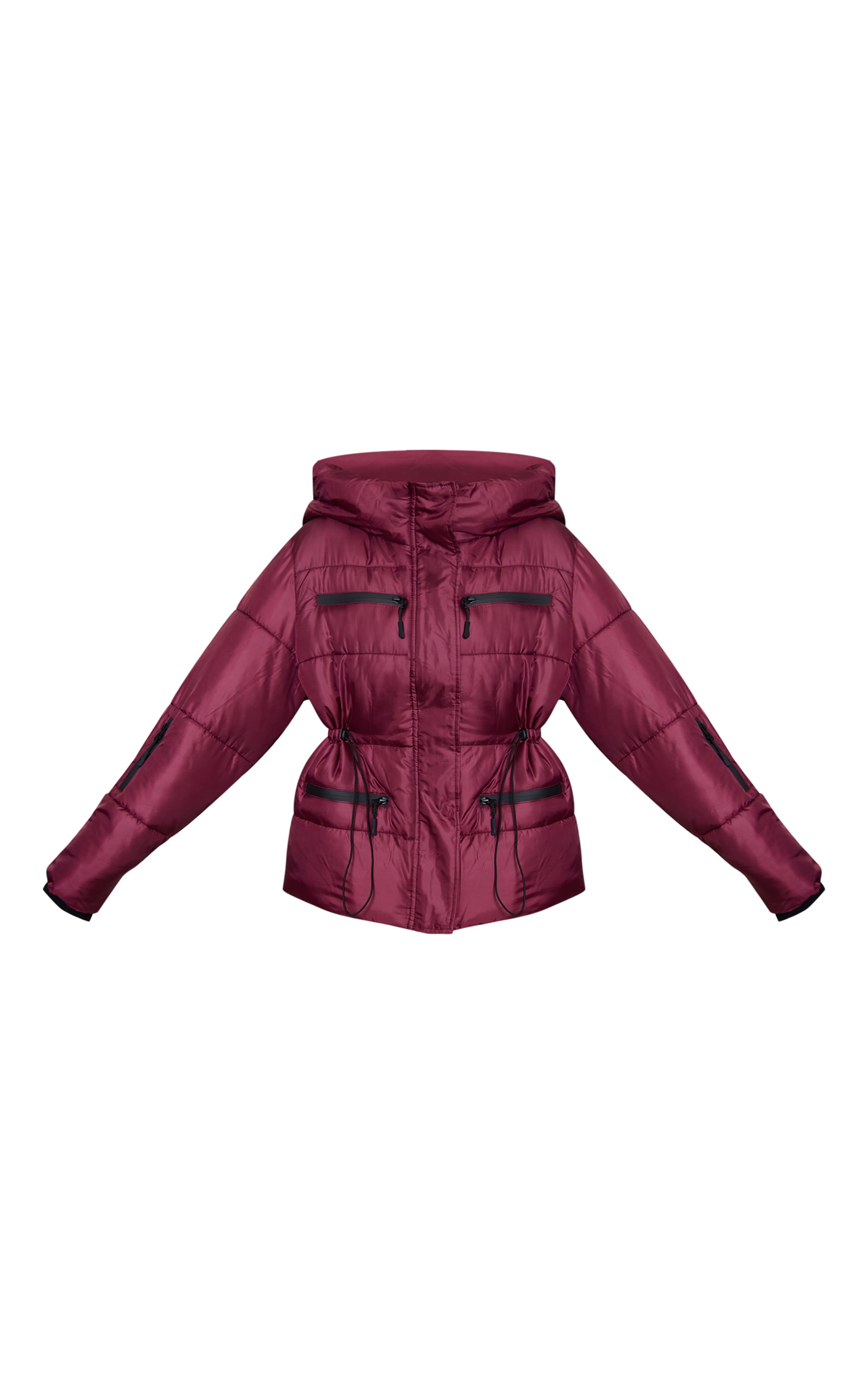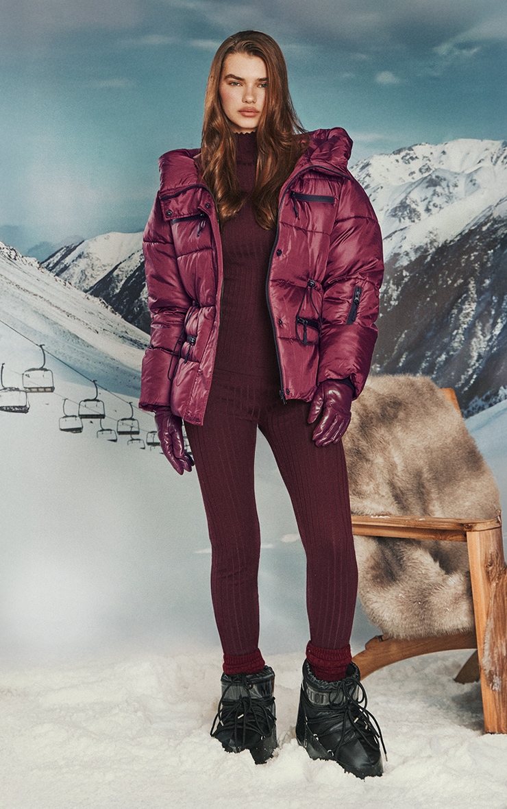 Opt for seasonal tones in this plum cinch pocket detail puffer coat. Made from plum toned fabric, this jacket has a cinched waist, pocket detailing and a puffer finish. Team it with a unitard and chunky boots for a polished outfit.