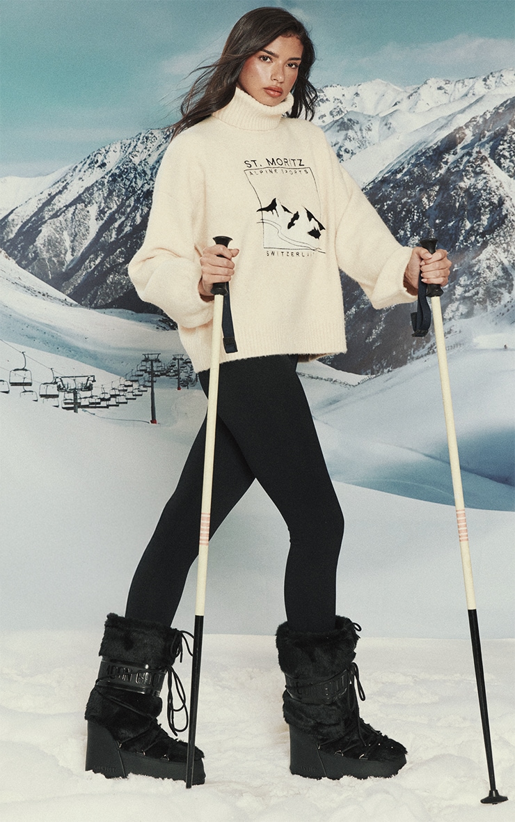 Introducing the cream mortiz slogan roll neck knitted jumper. Crafted from cream knit fabric, this jumper has an elegant roll neckline and Moritz slogan detailing. Pair it with leggings, boots and a puffer coat for the ultimate apres look.